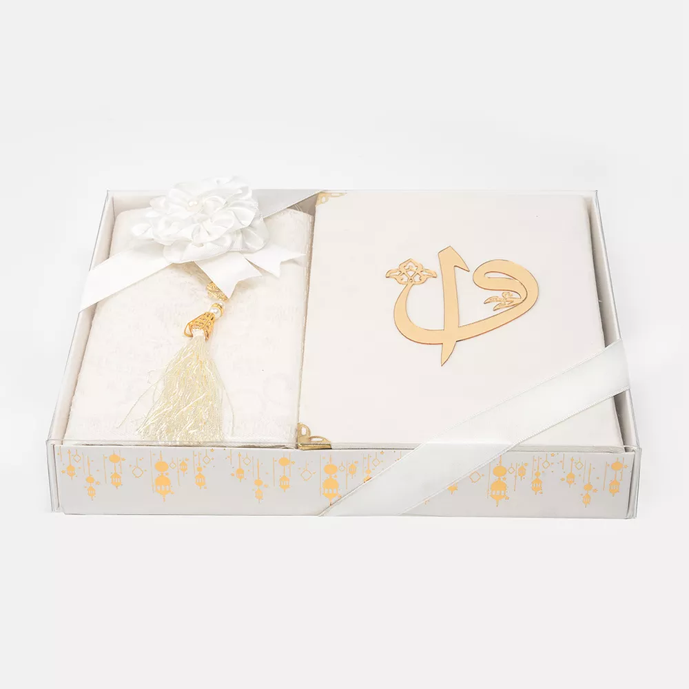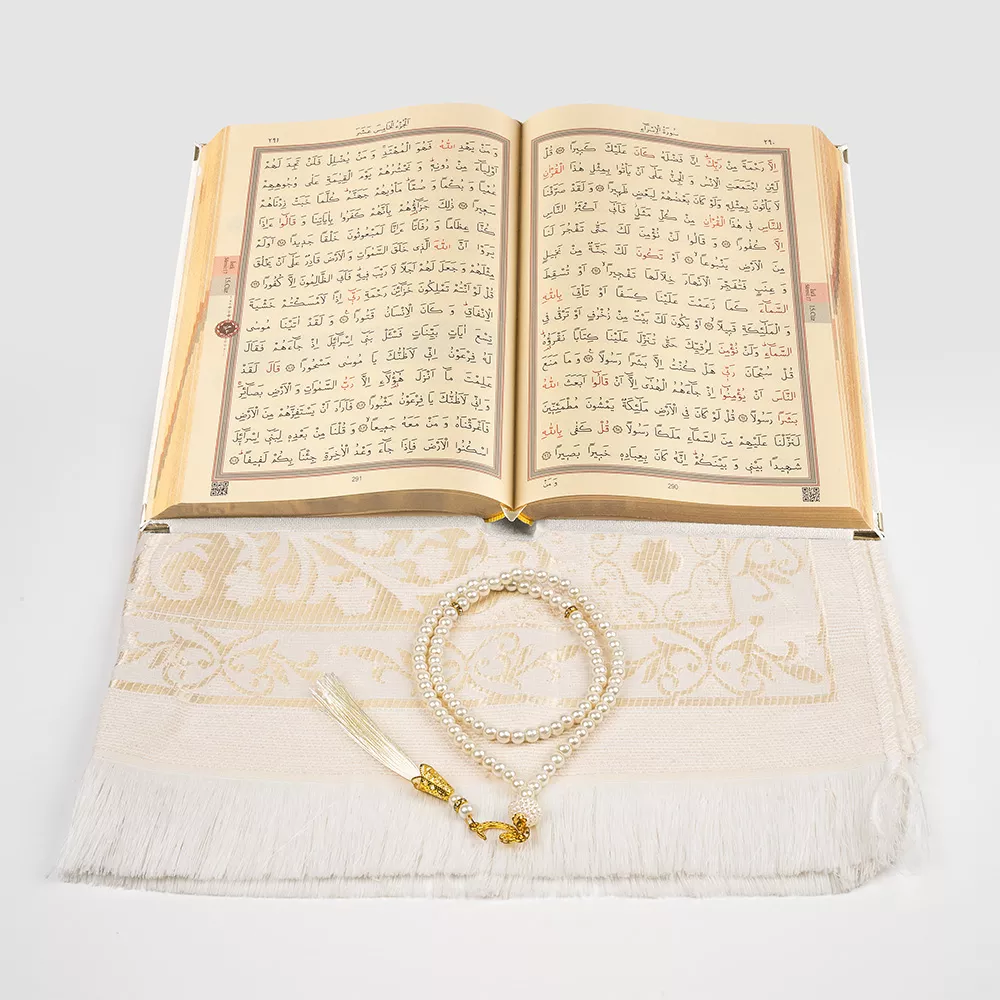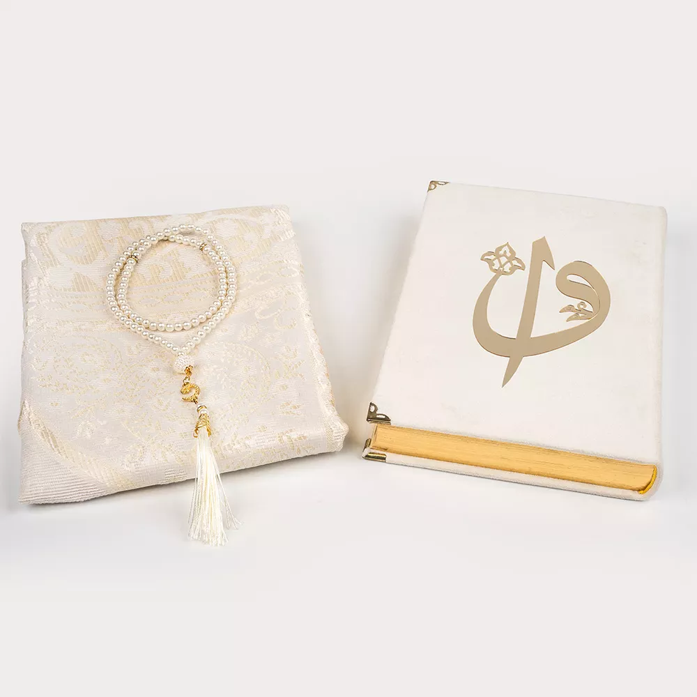 Hediyelik Kuran-ı Kerim Seti, Seccade + Tesbih (Kadife, Elif Vav, Hafız Boy, Beyaz)