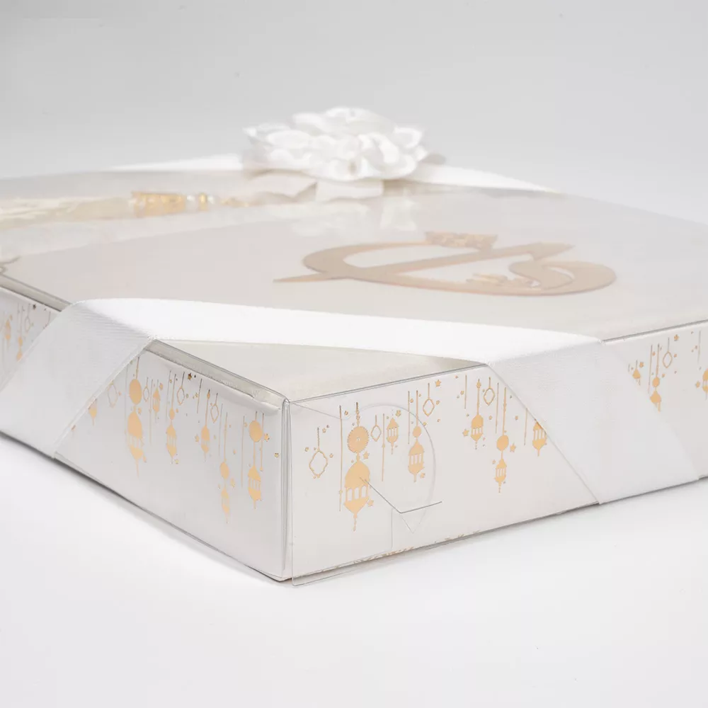 Hediyelik Kuran-ı Kerim Seti – Kadife Kaplamalı, Elif Vav Desenli, Seccade ve Tesbih (Hafız Boy, Beyaz)
