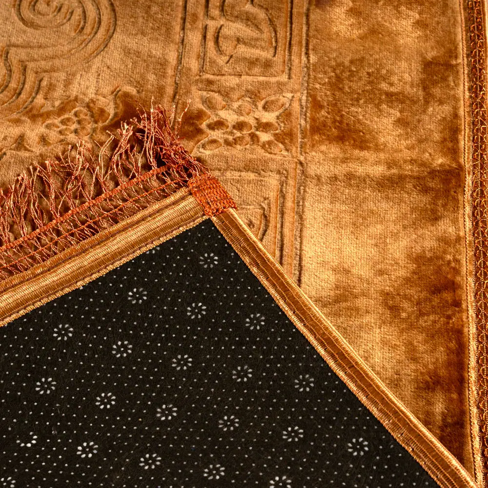 Peluş seccade, yumuşak dokusu ile ibadet sırasında daha konforlu bir kullanım sunmak isteyenler için özenle hazırlanmıştır. Sert zemin hissini azaltan yüzeyi sayesinde daha rahat bir deneyim sunar. Peluş kumaşın sağladığı yumuşak temas, kullanım sırasında fark edilir bir konfor sağlar. Gold rengi ile zarif ve estetik bir görünüm sunarak bulunduğu ortama şık bir dokunuş kazandırır.