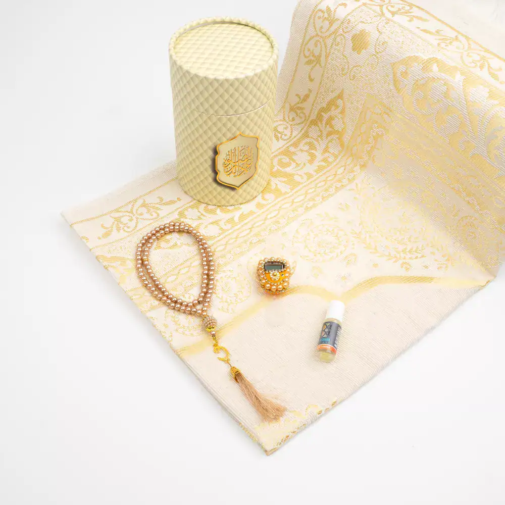 Seccade + Tesbih + Esans + Zikirmatik Hediye Seti (3D Desen, Gold)