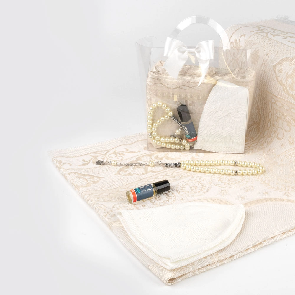 Seccade + Tesbih + Takke + Esans Hediye Seti (Çantalı Asetat Kutu, Krem)