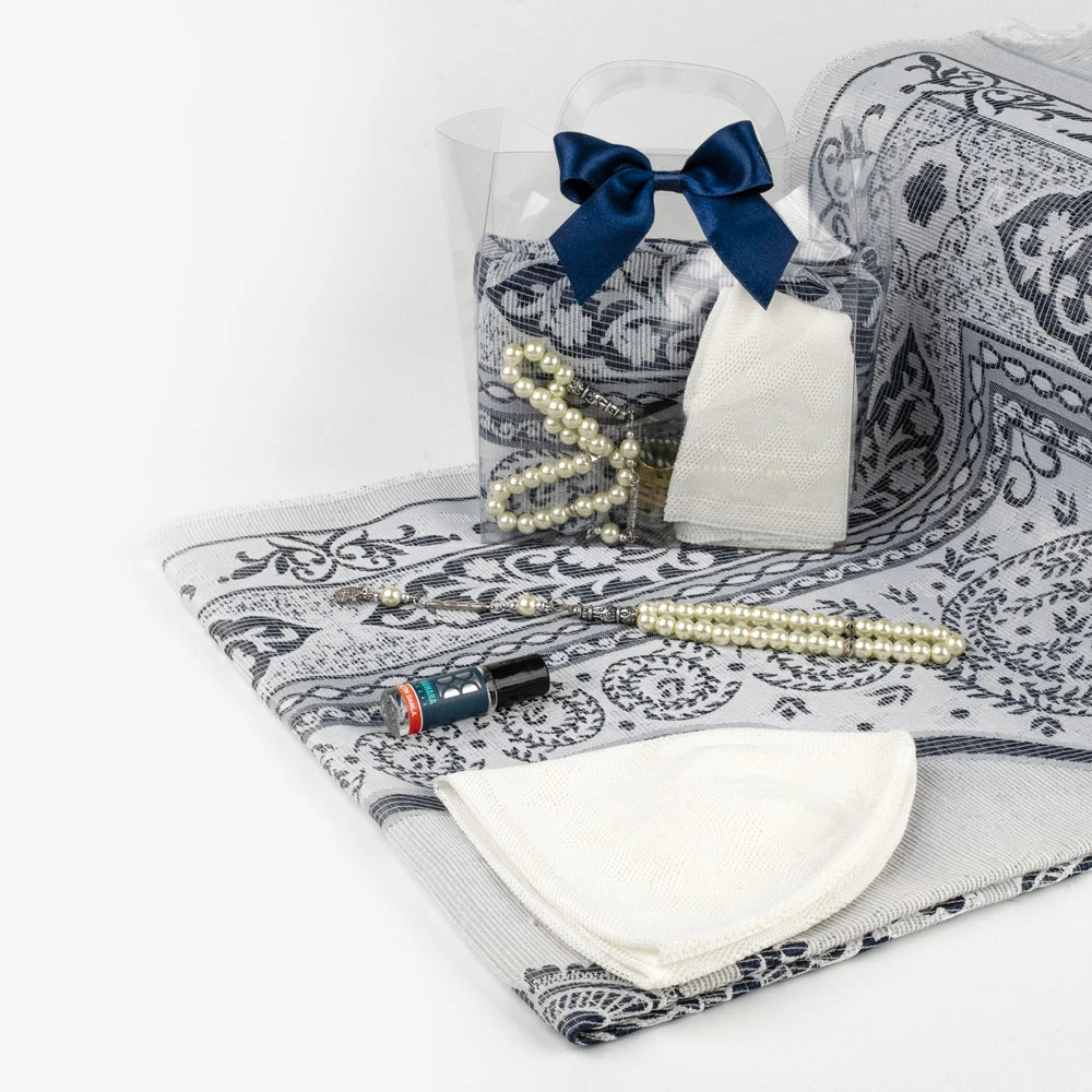 Seccade + Tesbih + Takke + Esans Hediye Seti (Çantalı Asetat Kutu, Lacivert)