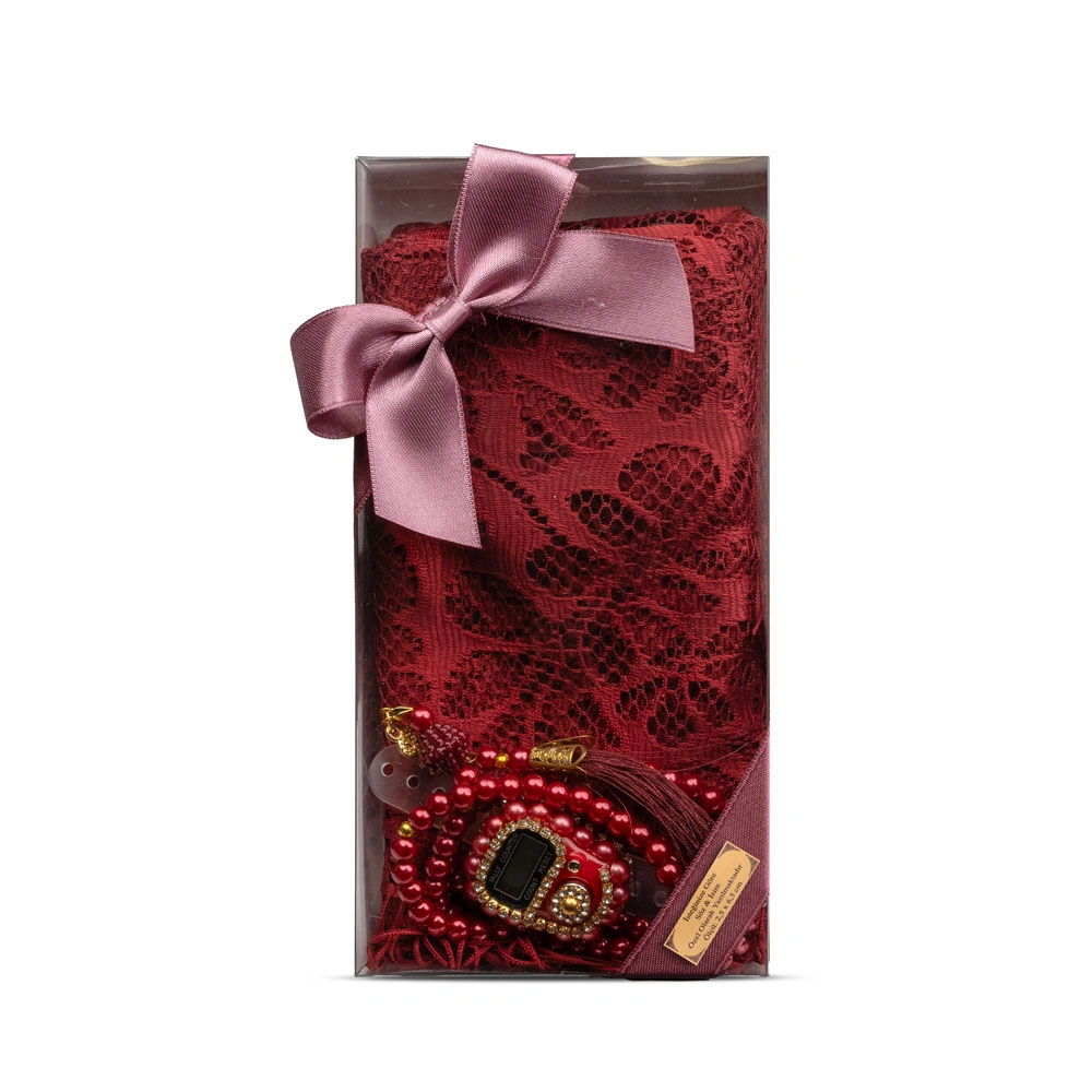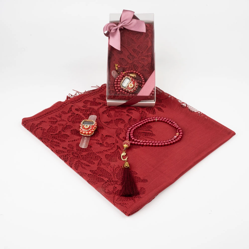 Tesbih + Dantelli Şal + Zikirmatik Hediye Seti (Bordo)