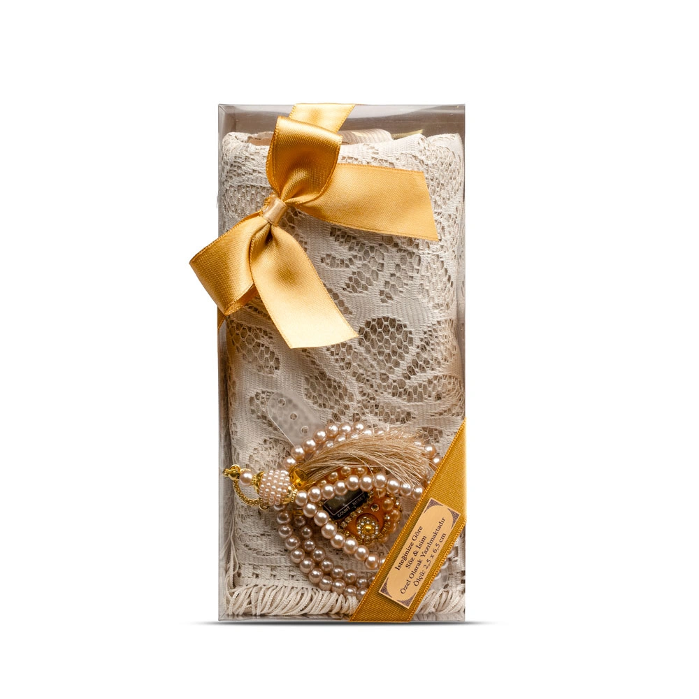 Tesbih + Dantelli Şal + Zikirmatik Hediye Seti (Çantalı Asetat Kutulu, Krem)