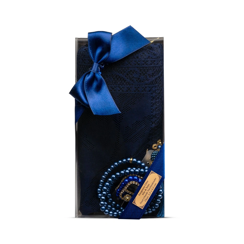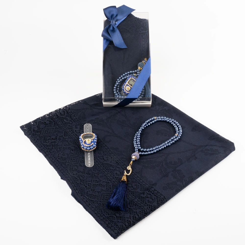 Tesbih + Dantelli Şal + Zikirmatik Hediye Seti (Lacivert)