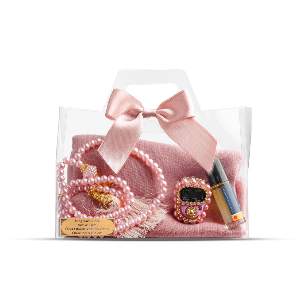Tesbih + Eşarp + Zikirmatik + Esans Hediye Seti (Çantalı Asetat Kutu, Pembe)