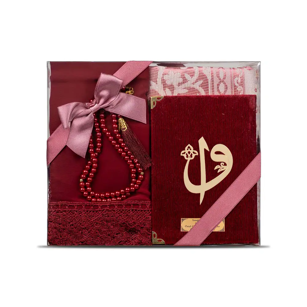 Yasin + Seccade + Tesbih + Şal Hediye Seti (Çanta Boy, Elif Vav, Bordo)