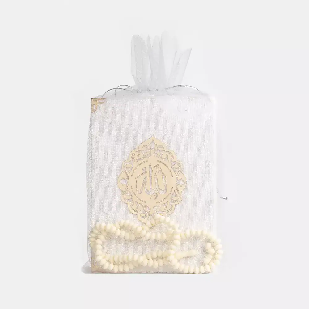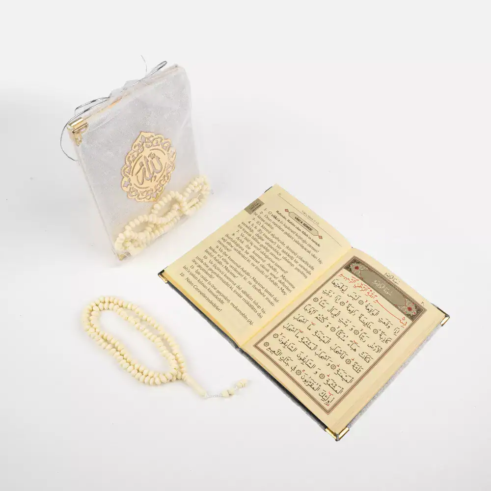 Yasinli Gül Kokulu Tesbih Hediyelik Set – Tül Keseli Çanta Boy (Şemse Lafzatullah, Krem)