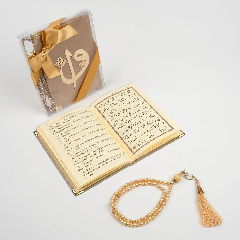 Yasinli İnci Tesbih Hediyelik Set (Çanta Boy, Elif Vav, Gold)