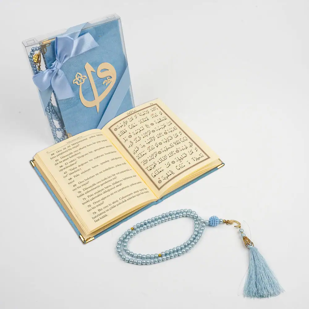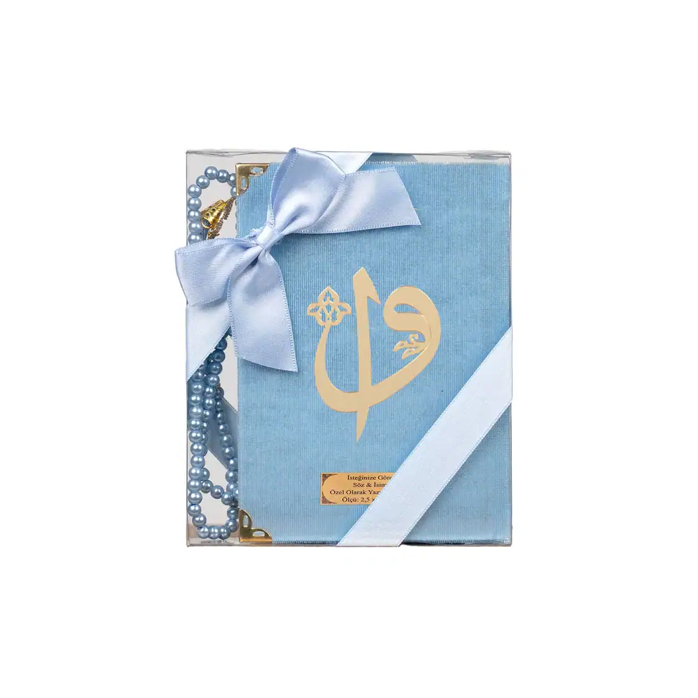 Yasinli İnci Tesbih Hediyelik Set (Çanta Boy, Elif Vav, Mavi)